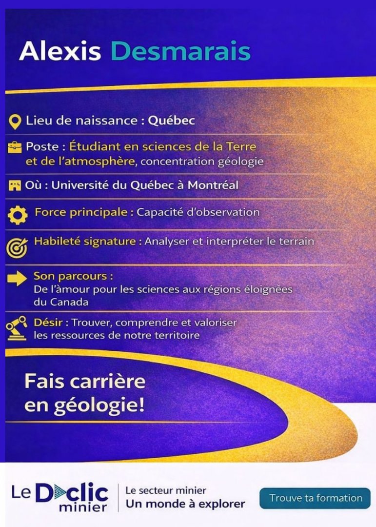 Au secondaire, Alexis était ce type d’élève qui comprenait facilement les sciences et qui s’y intéressait naturellement. Sa curiosité l’a suivi jusqu’au cégep, où un simple cours est devenu un véritable point de bascule : la géologie ne faisait pas que lui plaire, il en est devenu passionné.